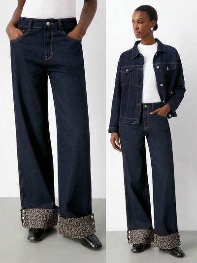 SHEIN Maija レオパード柄パッチワーク ワイドレッグ デニムジーンズ レディース 秋-25%