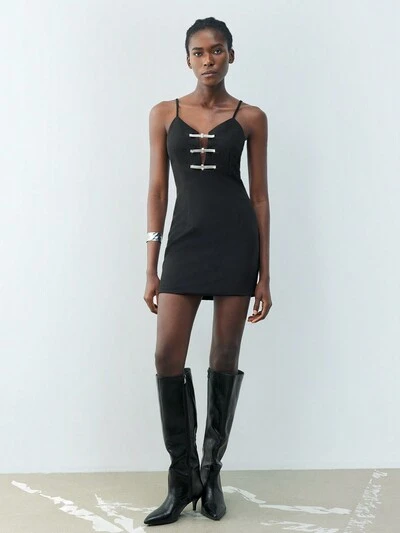 SHEIN Maija 春夏新作 黒色 編み込みメタルチェーン飾り付き レディース スカート、アーバン、モダンでエレガント、デイリーカジュアル通勤、旅行、パーティー、結婚式、デートなどに最適-60%