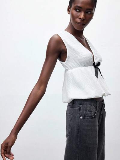 SHEIN Maija 女性用 Vネック ノースリーブ プリーツ トップス ホワイトリボン装飾、エレガント、快適、ミニマリスト、多用途、スリム、秋、ハロウィンに適しています-32%