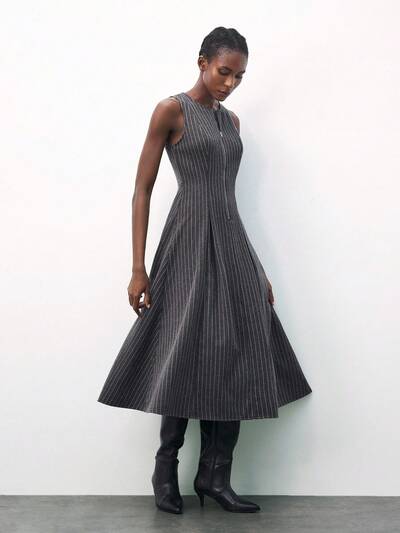 SHEIN Maija 女性用 ジップアップ ハーフプラケット ストライプ ラウンドネック ノースリーブ プリーツ カジュアルドレス