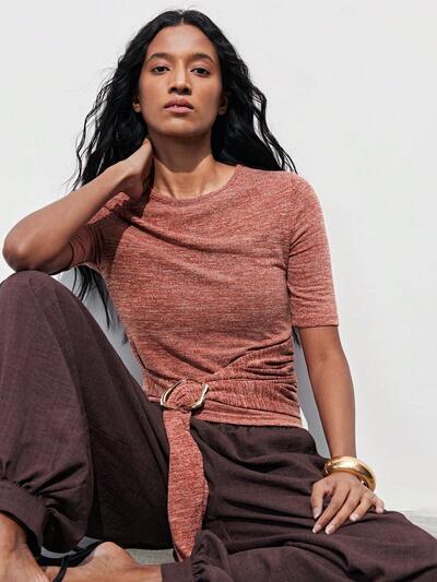 SHEIN Maija 女性ファッション ラウンドネック 半袖Tシャツ、ユニークなメタリック ウエストデザイン、モダンでスタイリッシュな外観を強調。シンプルでエレガント、快適で着やすい、様々なボトムスと合わせやすい、女性らしいファッションの魅力と優雅なシルエットを演出-23%