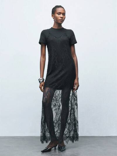 SHEIN Maija 신상 봄/여름 블랙 섹시 레이스 캐미솔 드레스 + 반팔 드레스 2피스 세트, 시크하고 우아한 오피스/캐주얼/파티/발렌타인 데이 의상