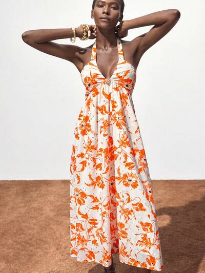 SHEIN Maija 2025년 여름 새로운 여성용 홀터 금속 장식 단추 자수 속이 빈 코튼 플로럴 프린트 타이 업 미디 드레스, 통근, 일상 캐주얼, 해변, 휴가, 파티, 웨딩 게스트, 음악 페스티벌, 독립 기념일, 졸업식에 우아함