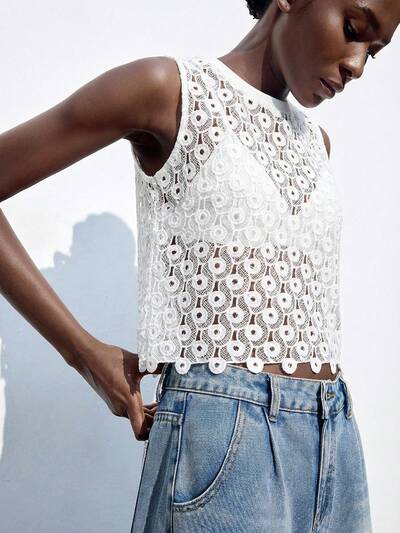 SHEIN Maija 여성 레이스 패치워크 브이넥 민소매 탑, 루즈핏 우아한 로맨틱, 패셔너블하고 편안한 탑, 휴가 비즈니스 캐주얼 웨어 서양 스타일 크리스마스 할로윈 파티 탑에 적합