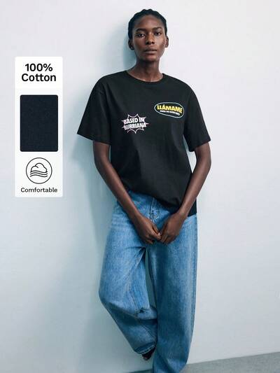 SHEIN X ArenalSound SHEIN Maija 여성 캐주얼 레터 그래픽 라운드 넥 반팔 티셔츠, 여름 블랙 그래픽 티, 빈티지 그래픽 티즈 배기 티셔츠 스트리트웨어 페스티벌 레이브-55%