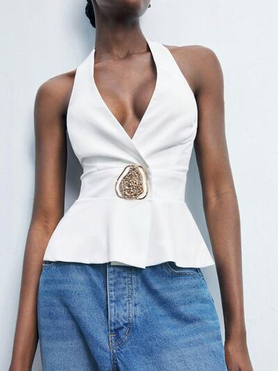SHEIN Maija 2025년 여름 새로운 비대칭 컷 패션 민소매 탑, 금속 수제 단추와 숨겨진 지퍼 백 디자인, 음악 축제, 졸업 외출, 휴가, 일상적인 우아하고 캐주얼, 파티 로맨틱, 패션, 다용도