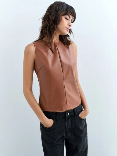 SHEIN Maija 여성용 가을/겨울 PU 가죽 풀오버 탱크 탑, 일상 다용도-60%
