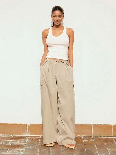 SHEIN Maija 여성 여름 휴가용 허리 묶음 유틸리티 포켓 와이드 레그 루즈 캐주얼 바지-55%