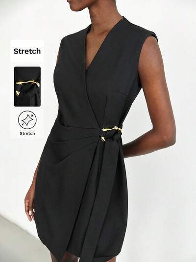 SHEIN Maija 여성용 블랙 V넥 민소매 드레스, 메탈 장식 버튼 포함, 봄/여름에 시크하고 패셔너블하며, 오피스, 비즈니스, 캐주얼 웨어에 적합-42%