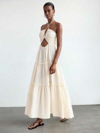 SHEIN Maija 여성용 살구색 홀로우 아웃 등이 벌어진 홀터 여름 드레스, 프릴 햄라인, 섹시한 캐주얼 루즈핏 비치 드레스 휴가용