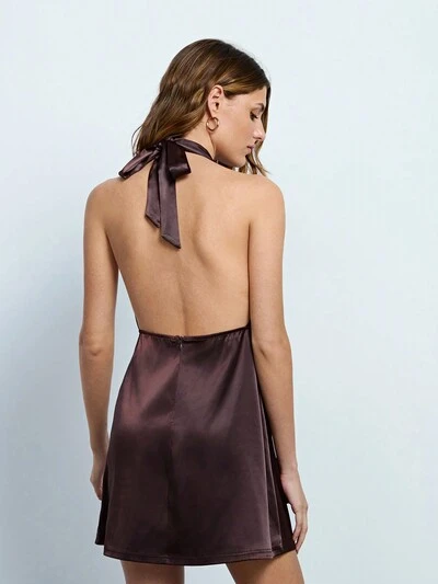 SHEIN Maija 여성용 솔리드 브라운 할터 넥 백리스 지퍼 업 우아한 미니 드레스-23%