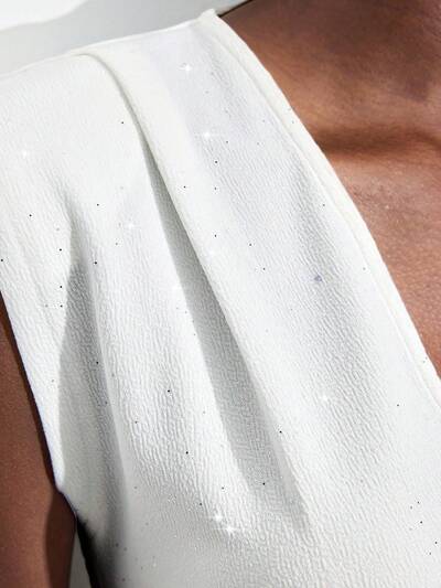 SHEIN Maija 여성용 아이보리 시퀸 텍스처 패브릭 반짝이는 버서타일 모던 어반 패션 소셜라이트 파티 필수품 브이넥 딥 브이 와이드 숄더 디자인 프론트 플리츠 장식 백 히든 지퍼 비즈니스 캐주얼 오피스 웨어 로우키 빈티지 우아한 어반 통근 편집장 추천 소셜라이트 리조트 파티 드레스