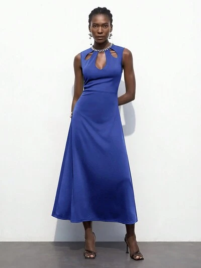 SHEIN Maija 여성용 라인 스톤 네크라인 체인 장식 중공 커트아웃 벨트 플레어 헴 드레스, 여름 웨딩-23%