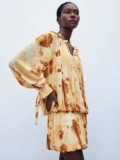 SHEIN Maija 여성 노랑 여름 드레스, 세련되고 우아한 플로럴 프린트 브이넥에 러플 디테일, 허리 타이 루즈핏, 플레어 헴, 긴 소매, 캐주얼 비치 휴가용 미니 드레스-23%