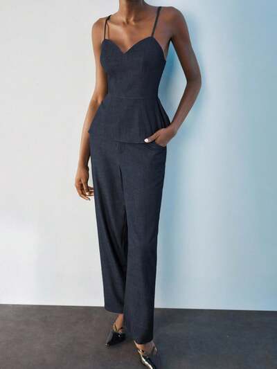 SHEIN Maija 여성용 갈색 여름 의상: 조절 가능한 스트랩 백리스 크롭 톱 플랜트 프린트 & 탄성 허리 와이드 레그 팬츠 2피스 세트