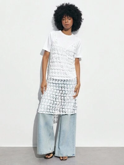SHEIN Maija 2025년 봄/여름 & 초가을 7월 4일, 졸업 시즌 캐주얼 우아한 화이트 코튼 자수 할로우 디자인 모던 리조트 패션 솔리드 컬러 할로우 셔츠 & 반바지 여성용 2피스 세트-60%