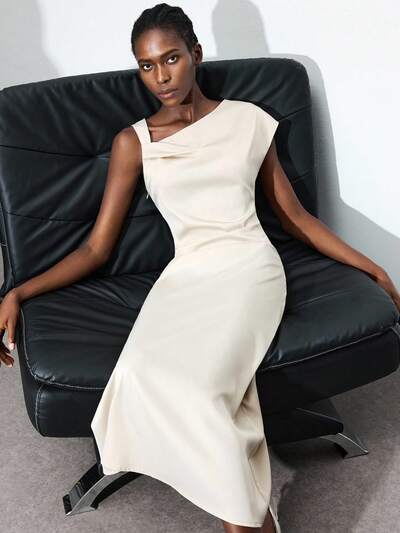 SHEIN Maija Women's Elegant Solid Color Asymmetric Neck Dress, Summer Asymmetrical Dress Creme Dress Tall Dress Draped Dress One Shoulder Dress Business Casual Women's Wear, Office Wear, Low-Key Old Money Style, Effortless Temperament, High-End Urban Commuting, The Same Style As The Editor-In-Chief Of The Magazine, Urban Social Vacation Party Wear, Charming, Low-Key And Durable Basic Style, Versatile And Not Picky Clothing, Street Fashion Wear, Clothing, Coffee Shop, Relaxed Wear All-Season Women's Airport