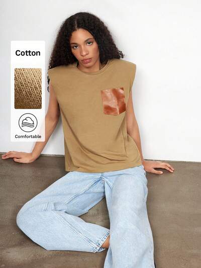 SHEIN Maija Khaki Faux Leather Splicing Padded Shoulder Sleeveless Women's Tank Top, Comfortable Skin-Friendly Fashion Versatile Slim Fit Casual Everyday Wear