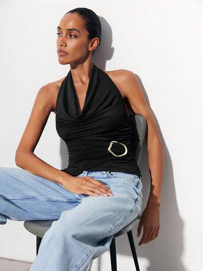 SHEIN Maija Women's Black Ruffled Neck Waist Pleated Metal Decor Button Solid Color Minimalist Sexy Sleeveless Top, Suitable For Holidays, Parties, Outings, Date Nights Halloween Women Party