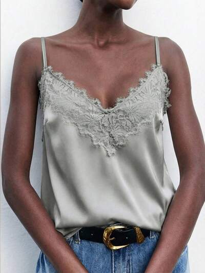 SHEIN Maija Women's Gray Lace Patchwork Top, Elegant Romantic Chic Comfortable Loose V-Neck Adjustable Spaghetti Strap Vacation Business Casual Western Style Cruise Wear Versatile Sleeveless Top St Patrick's Day Women Easter Summer Outfits Easter Dress Women Party Top Beach Dress Summer Holiday Outfits Each Vacation Outfits For Women Summer Outfit For Women Going Out Outfits Graduation Graduation Outfit Casual Dresses Casual Blouses For Women,Summer Top