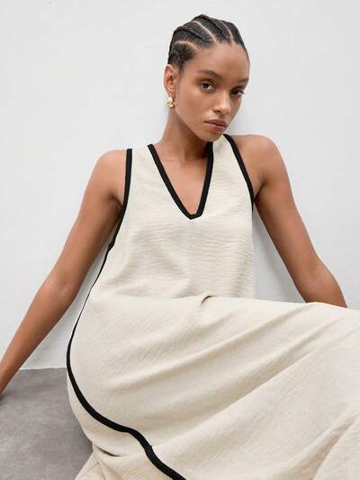 SHEIN Maija Outfit Deas For Dress,2026 Summer Vacation Women's Casual Sleeveless Color Block Trim Dress,Going Out Outfits, Casual Women's Dresses , Vacation Outfits Women Textured Dress Dress Midi V-Neck Midi Dress Sleeveless Dress,Vacation Outfits Women,Summer Holiday Outfits ,Beach Vacation Outfits For Women V-Neck Dress Women's Dress Long Dress New In Dresses