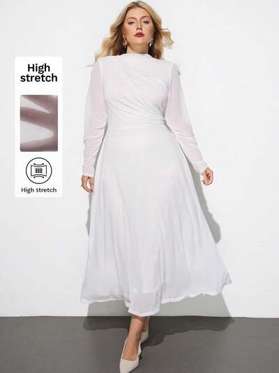 SHEIN Maija Plus Size Women's Solid Color Fitted Waist A-Line Long Dress, Urban Commute Business Casual Summer Dress, Elegant Dress For Women White Plus Size Dresses For Women Chiffon Dress Curve Mother's Day