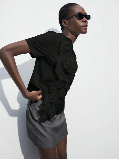 SHEIN Maija Women's Black Front Ruched Decor Fashionable Elegant Solid Color Minimalist Casual Round Neck Short Sleeve T-Shirt For Daily Wear Romantic, Fashion, Versatile , Suitable For Summer Vacation, Comfortable, Bohemian Style, Beach Wear, Swimsuit Cover-Up, Stylish, Elegant, Casual, Simple Daily Wear, Country Style, Essential, Solid Color, Holiday Casual,Autumn Outfits For Women, Christmas Women's Clothing,National Day T-Shirt