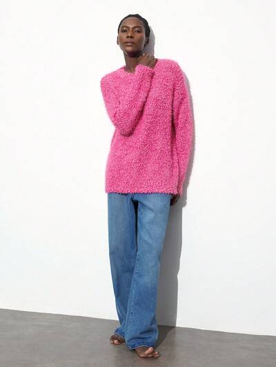 SHEIN Maija Women's Fuschia Casual, Versatile Knitted Loose Drop Shoulder Crew Neck Sweater, Elegant And Comfortable, Suitable For Spring Hippie