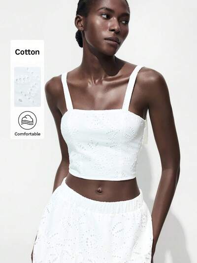SHEIN Maija Women's White Woven Eyelet Crop Top Cute And Casual Summer Top With Straps And Zipper Detail