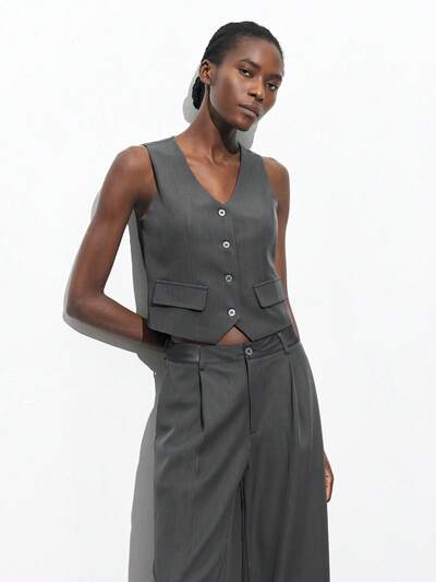 SHEIN Maija 2025 Summer New Grey Series Backless Patchwork Adjustable Metal Buckle Design, Modern Elegant Urban Casual Commute Music Festival Beach Resort Daily Casual Romantic City Holiday Suitable For Going Out Parties, Weddings, Graduation Season Ladies Camisole Top-23%