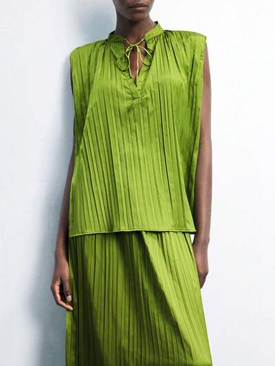 SHEIN Maija Women's Green Satin Pleated Design Spring Summer Attire, Contemporary Resort Boho Chic Versatile Relaxed Fit With Slight Stretch, Loose Dolman Long Sleeve Mock Neck With Bowknot Neck Decoration, Suitable For Business Casual, Concerts, Cruises - Elegant, Sophisticated, Romantic, Effortless High-End Look-33%
