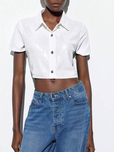 SHEIN Maija 2025 Summer New Arrival White Sequin Accent Front Open Cardigan With Metal Button Design, Versatile Beach, Casual, Vacation, City, Party, Wedding Guest - Graduation Season-60%