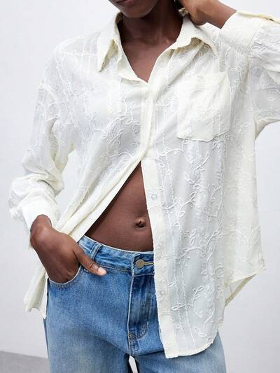 SHEIN Maija 2025 Nowa letnia modna damska koszula, odpowiednia na festiwal muzyczny, ukończenie szkoły, wakacje, plażę, święta, teksturowany kwiatowy nadruk, kołnierzyk z guzikami z przodu, długi rękaw, elegancka na co dzień, do biznesu, na imprezę, na co dzień i uniwersalna-38%