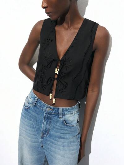 SHEIN Maija 2026 Wiosna/Lato Nowy damski czarny żakardowy haftowany dekolt w serek z wiązaniem z przodu i perłowym zdobieniem w stylu boho, bez rękawów, swobodny, krótki top, odpowiedni na wiosenną przerwę, festiwale muzyczne, letnie wyjścia, wiązanie z przodu, swobodny, biznesowy, uroczy czarny top, letnie wakacje