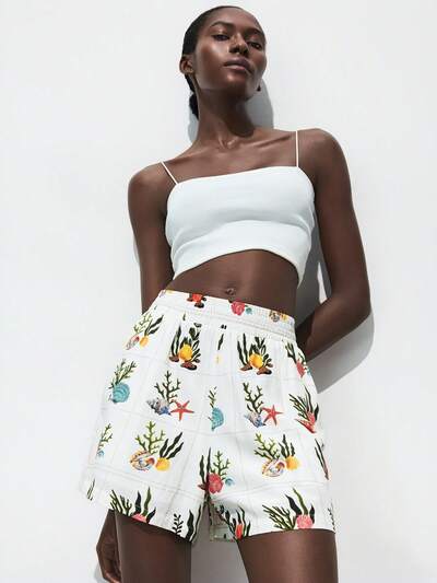 SHEIN Maija Damskie szorty z nadrukiem muszli, elastyczna talia, luźne nogawki, letnie ubrania, damskie ubrania, letnie stroje dla kobiet, stroje wakacyjne, damskie ubrania boho, damskie mikro szorty, zwiewne szorty, stroje wakacyjne, damskie stroje plażowe dla kobiet