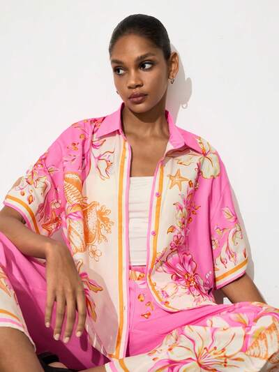 SHEIN Maija Damska koszula z nadrukiem na całej powierzchni, zapinana z przodu na guziki, luźna i swobodna