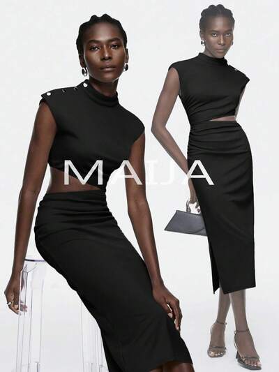 SHEIN Maija Damska letnia sukienka bez rękawów, kołnierzyk, guziki, ozdoba w talii, wycięcie, marszczona, szczupła, elegancka-32%