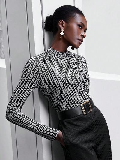 SHEIN Maija Wiosenno-letni top z golfem i nadrukiem na całej powierzchni, idealny na wesele, randkę, przyjęcie, koncert, brunch, lotnisko, na wiele okazji-60%