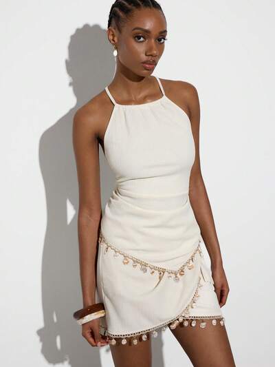 SHEIN Maija Damski, wakacyjny, swobodny, jednokolorowy, koronkowy, patchworkowy top z odkrytymi plecami i halterem-23%