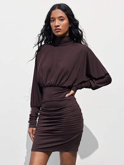 SHEIN Maija Jednokolorowa sukienka damska z kołnierzykiem i ozdobnym paskiem w talii, z długimi rękawami, o minimalistycznym i eleganckim stylu. Dopasowany krój podkreśla figurę, nadaje się zarówno do pracy, jak i na co dzień, podkreślając kobiecą pewność siebie i wyrafinowanie.
