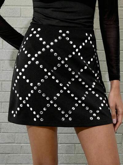 SHEIN Maija Czarna spódnica z kryształkami w kształcie rombów, idealna na miejskie imprezy i spotkania