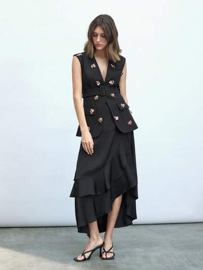SHEIN Maija 2025 Nowoczesna, plisowana, aksamitna spódnica damska z ozdobnymi kryształkami, wczesną jesienią, czarna, idealna na imprezy i powrót do szkoły, kostium na Halloween dla kobiet, czarna spódnica, "Miasteczko Halloween", święto narodowe, Nowy Rok, elegancka spódnica na imprezę, spodnie wyjściowe, czarna spódnica do tańca maturalnego, cosplay, zdobiona kryształkami, plisowana, szeroka, linia A