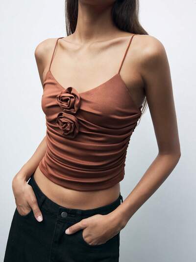 SHEIN Maija Damski elegancki jednolity kolor 3D kwiatowy wystrój marszczona impreza dopasowany dopasowany top Cami, jesień/zima-60%