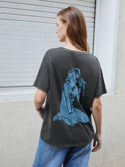 SHEIN Maija Damska szara, modna, oliwkowo-zielona, z nadrukiem graficznym, luźna, opadająca na ramiona koszulka z krótkim rękawem, swobodny sweter w stylu hippie-33%