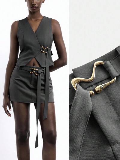 SHEIN Maija Saia Urbana Casual Feminina com Decoração Metálica Mini, Adequada para Primavera/Verão, 4 de Julho, Orgulho Feminino, Clube, Professor, Estilo Clássico de Dinheiro Antigo, Ornamento Metálico Assimétrico Exquisito e Elegante, Streetwear, Outono, Casual Workwear, Casual Business Casual