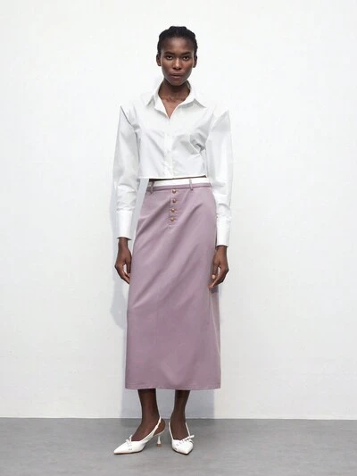 SHEIN Maija Saia Reta com Fechamento Frontal de Botão de Metal, Cintura Bicolor, Ideal para Volta às Aulas no Outono