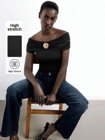 SHEIN Maija Bodysuit de Tricô Casual e Chique Ombro Caído com Decoração Metálica, Adequado para Férias na Primavera/Verão