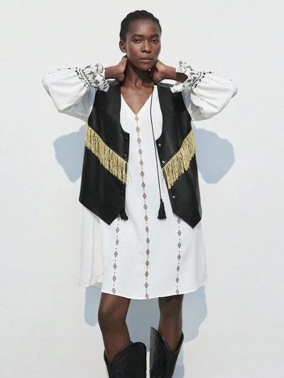 SHEIN Maija Colete Jaqueta Feminina de Moda Boêmia com Decoração de Borlas Brilhantes em Couro PU, para a Primavera/Verão-23%