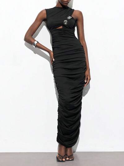 SHEIN Maija Novo Vestido Longo Feminino Elegante Romântico Moderno Apropriado para Usar na Rua, Festa, Festival de Música, Estilo Old Money, com Cintura Plissada Preta, Decoração de Botão de Concha, para Primavera e Verão