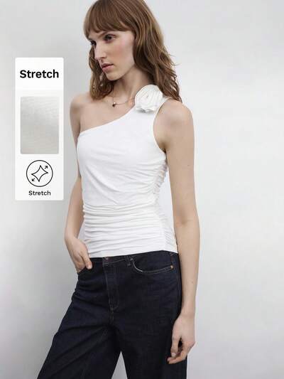 SHEIN Maija Top Feminina Marfim de Ombro Oblíquo Enrolada com Detalhe de Babado Floral, Vestuário Versátil de Design Minimalista para Primavera/Verão, Adequado para Férias